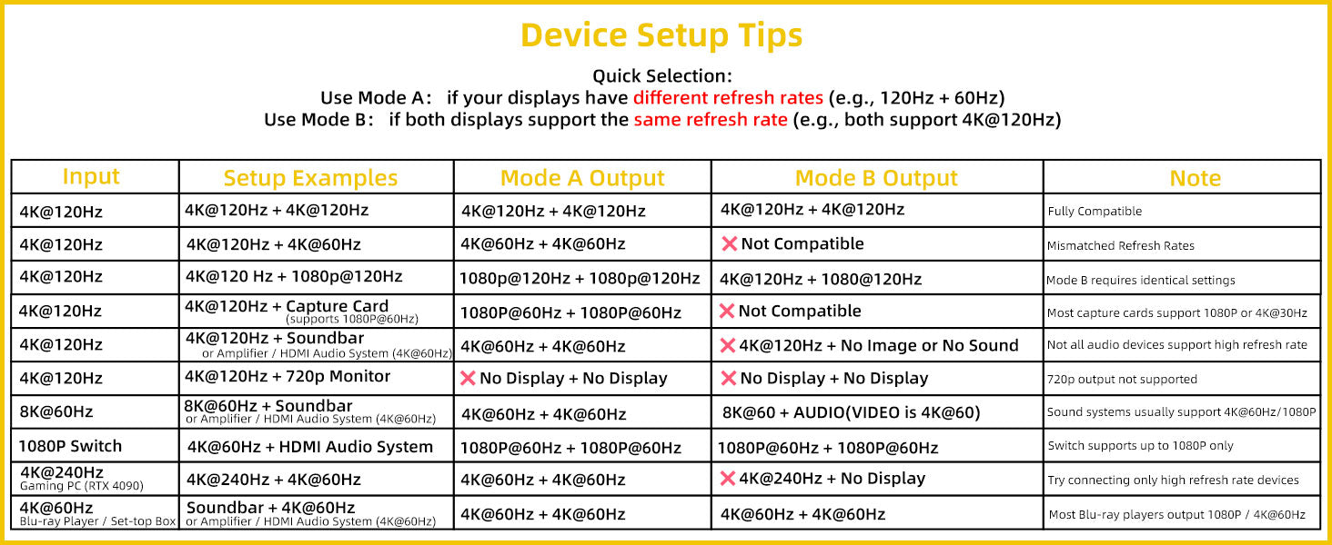 - Mixed Resolution Downscaling: Features Dual EDID detection for compatibility with different resolution displays; scales 8K content to 4K or 1080p while maintaining seamless performance (not compatible with 720p downscaling or frame rate conversion).